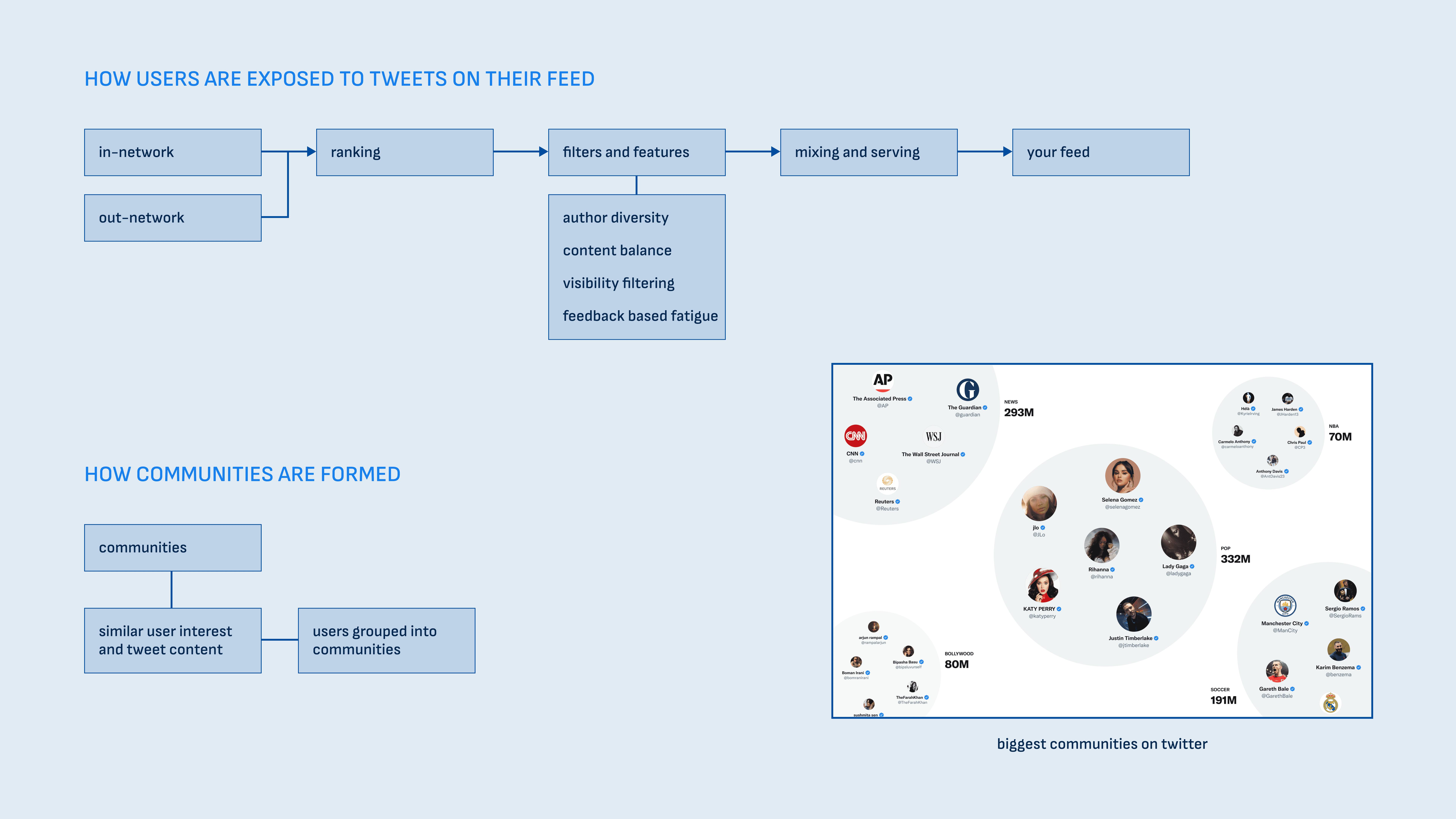 The following flowchart explains how Tweets appear on peoples feeds and how communities are formed. Some of the biggest communities being, pop culture, news and football.