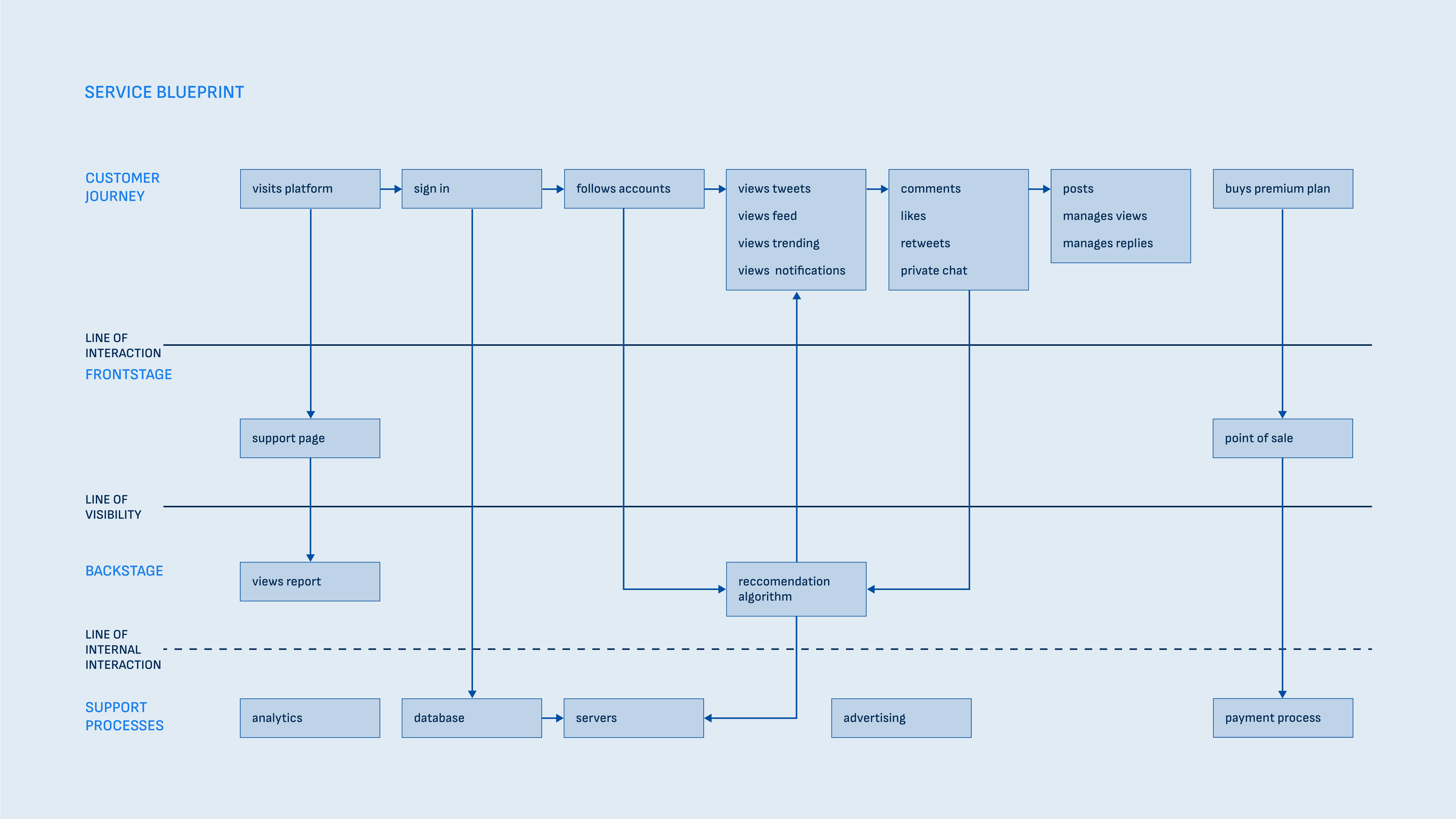 The following service blueprint of the Twitter platform maps out connections between user actions and processes that are seen and unseen to the user and the supporting processes.